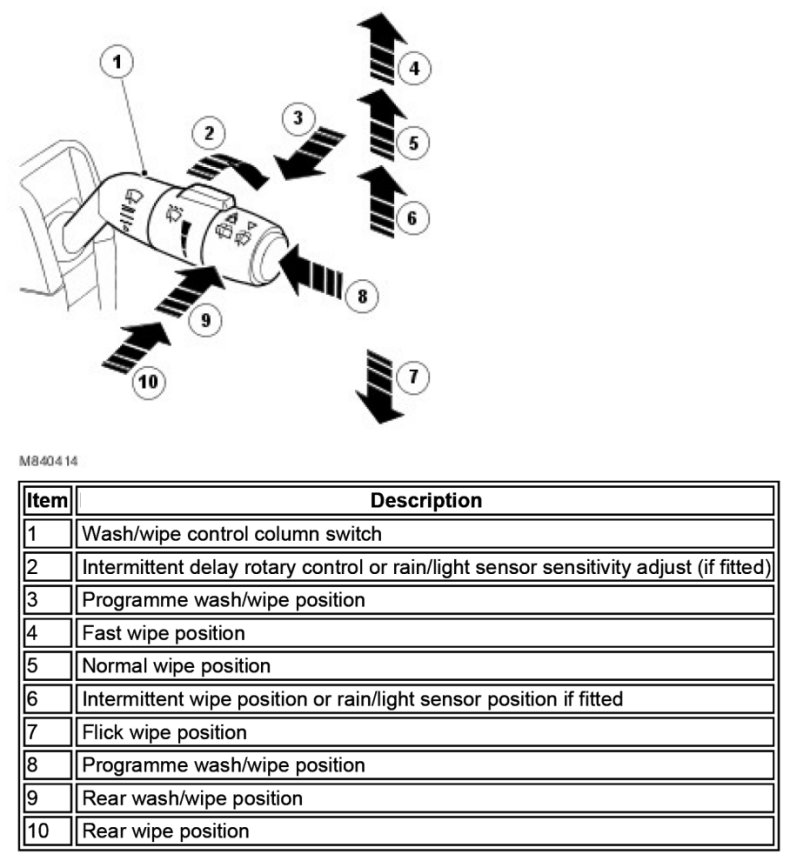 The wiper control column switch is located on the right hand side of the steering column and controls all front and rear wiper functions.