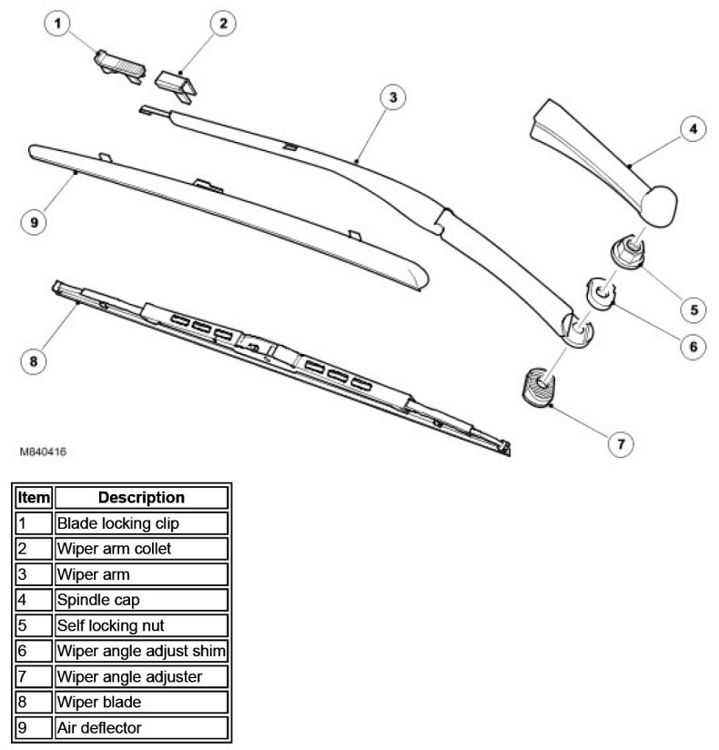The wiper arms are positively located on tapered splines on the wiper linkage spindles. The arm is located on a curved wiper angle adjuster, which mates with the curved underside of the arm attachment. A curved slot in the arm attachment locates an adjustment shim and the 3 components are retained under compression on the spindle spline by a self-locking nut.