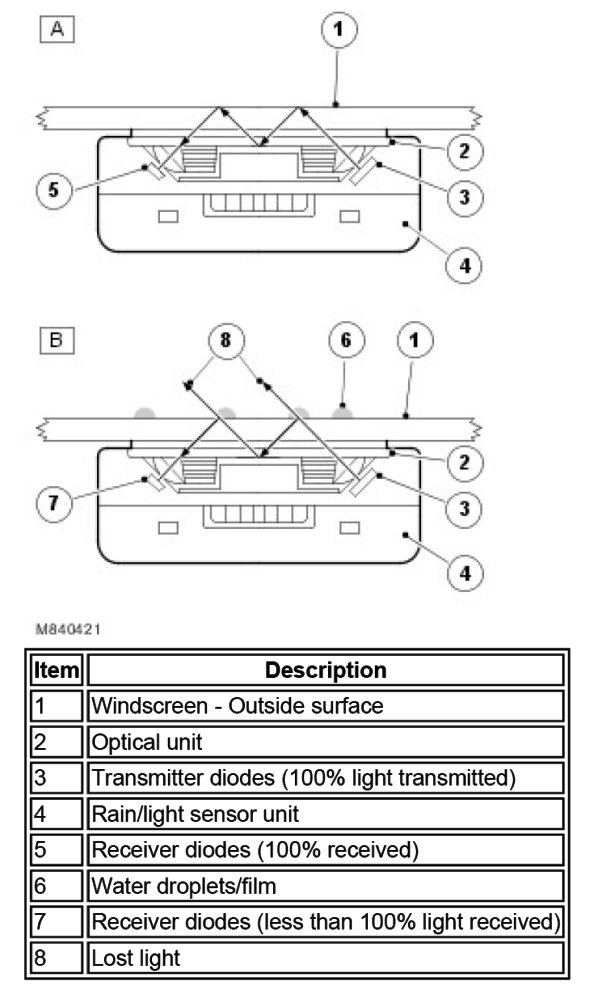 The sensor provides information to the GEM, via the K bus, for the optimum wiper operation for the prevailing conditions to maintain the screen in a clear condition at all times. The rain/light sensor is an optical unit, which operates on an infrared waveband. The sensor uses the principle of the laws of reflection on interfacing surfaces between materials with differing refraction indices.