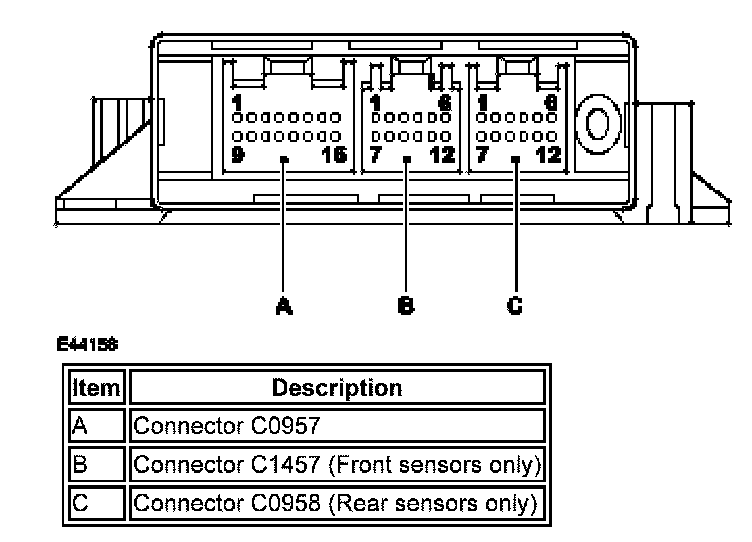 Three connectors on vehicles with front and rear sensors and two connectors on vehicles with rear sensors only provide the interface between the parking aid module and the external parking aid components.