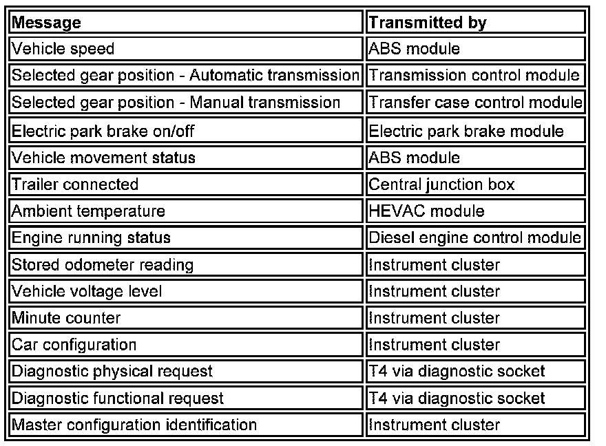 The parking aid module receives the messages shown in the following table which are used to control the parking aid system.