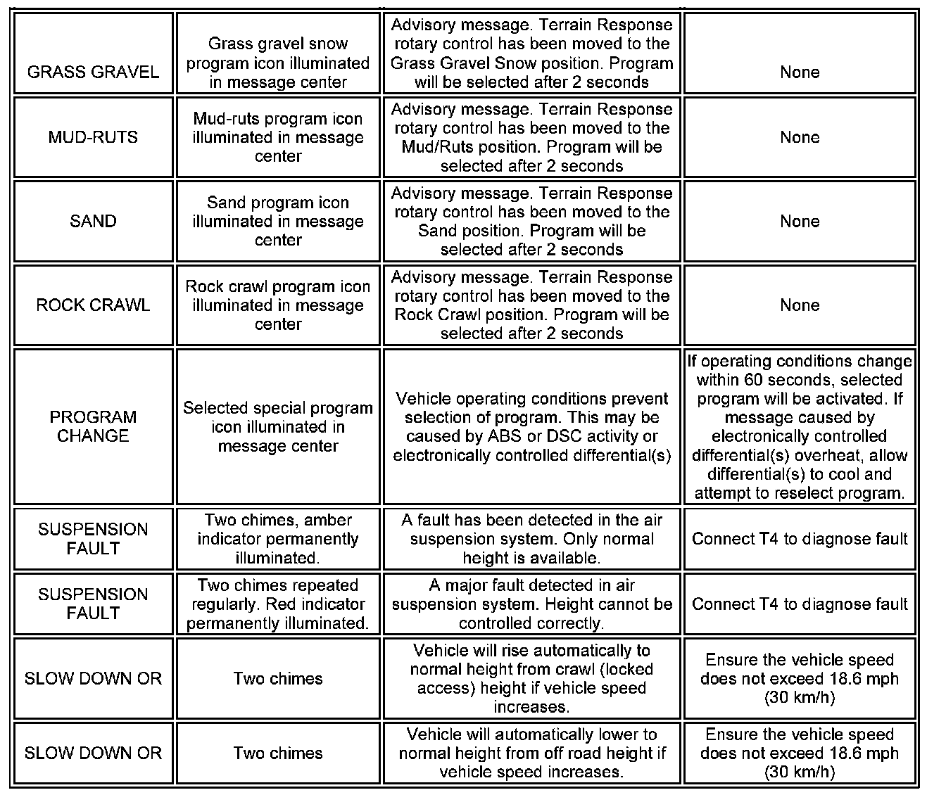 If a Terrain Response(TM) message is received, the display will change to a mode 3 display, appropriate for the additional information to be displayed. The instrument cluster reviews the information required to be displayed and shows the appropriate format.