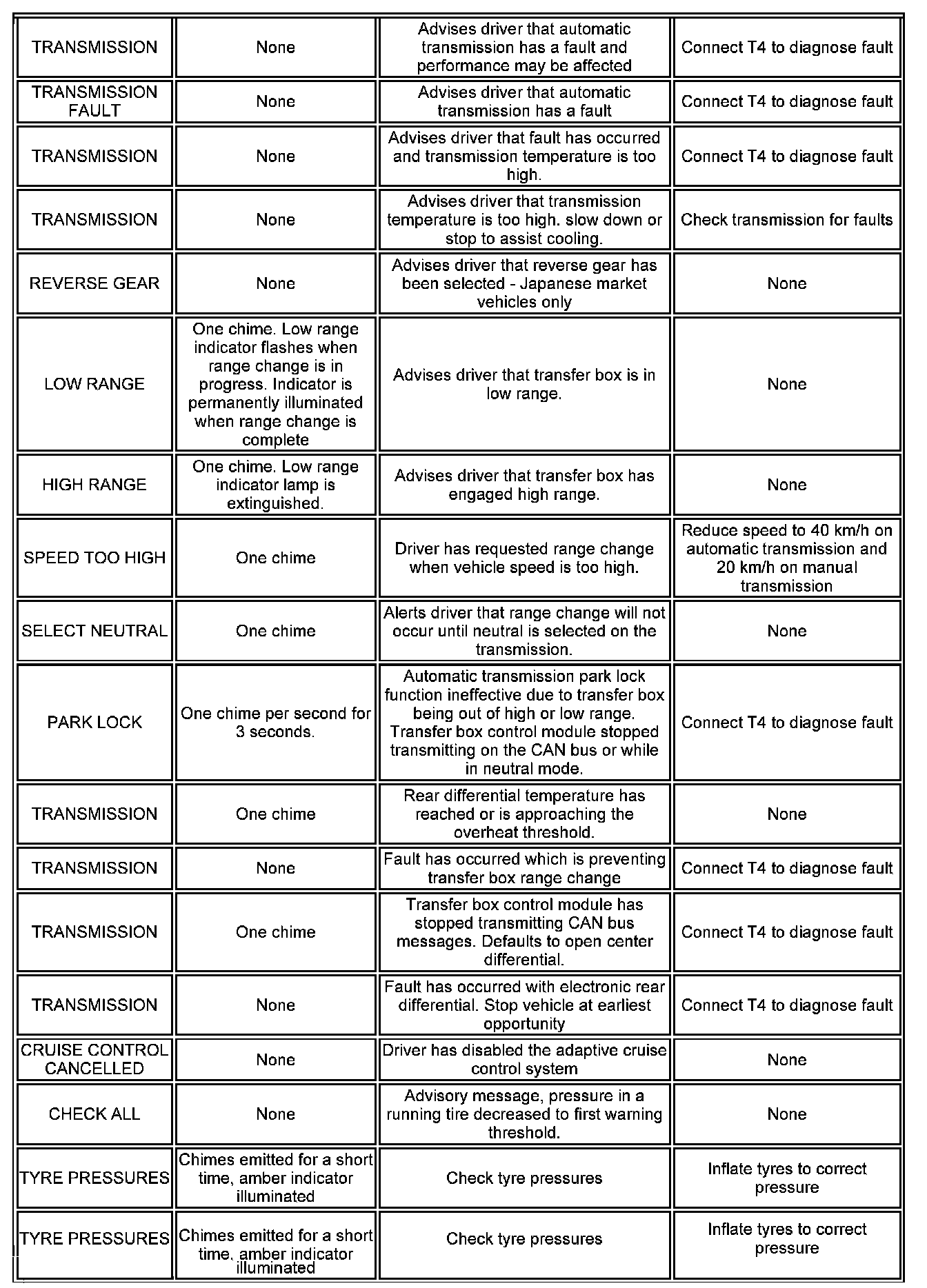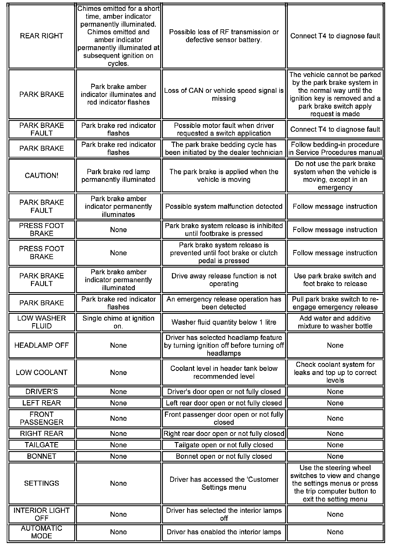 The messages are displayed in a language applicable to the market configuration of the vehicle and can be changed using T4. The following list shows the possible messages which can be displayed, other visual or audible warnings and a description of the message.