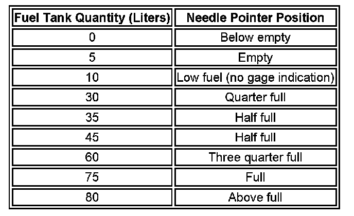 The following table shows the fuel tank fuel quantity and the respective pointer positions.