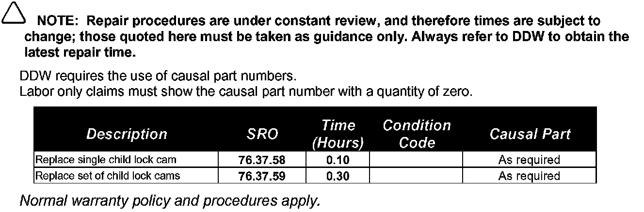 Should it become necessary to replace the child lock cam, refer to the Repair Procedure detailed in this bulletin.