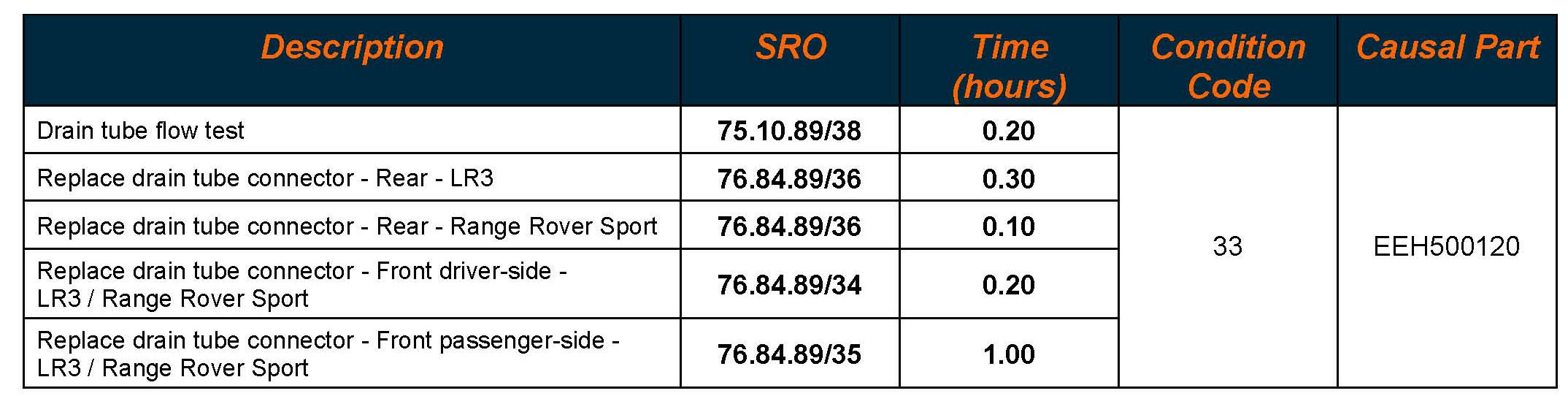 If water flows from all roof opening panel drain tubes, refer to Technical Bulletin LTBOOO34 (Range Rover Sport) or LTB00217 (LR3); to be carried out as a separate claim.