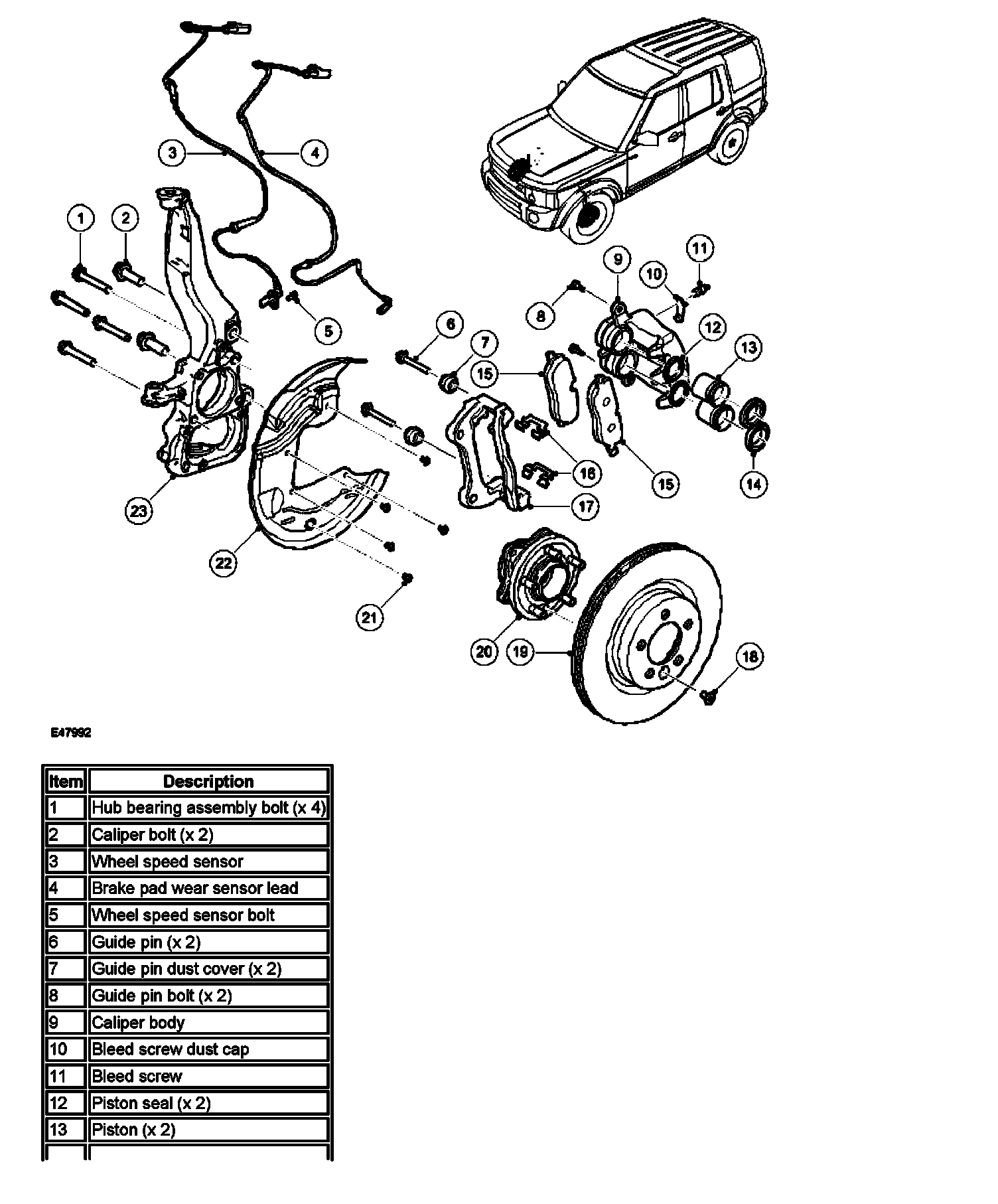 The front brakes each consist of a twin piston brake caliper, a ventilated brake disc and a dust shield. 4.4L models feature a different caliper and a larger diameter brake disc than the 4.0L and 2.7L Diesel models. The dust shield is common on all derivatives.