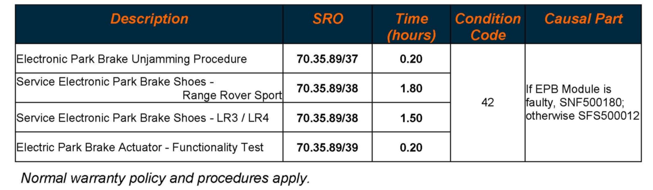 ^ A screech noise when applying or releasing the Electric Parking Brake (EPB) while the vehicle is stationary. The EPB warning lamp may be illuminated and DTC C1A43-00, C1A53-68 and / or C1A46-62 may be stored.