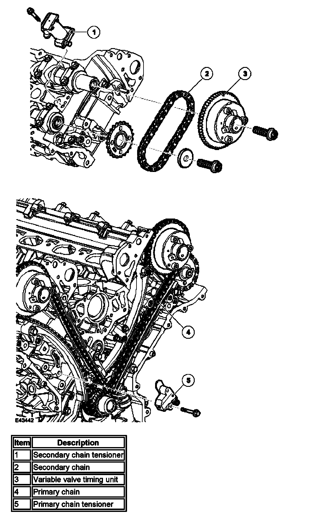 A key locates the two drive sprockets on the crankshaft. The crankshaft's torsional vibration damper retains the sprockets in position. The variable valve timing units and the exhaust camshaft sprockets are non-interference, non-keyed fits on their respective camshafts, the drive being transmitted by the face to face friction load produced by the valve timing unit/sprocket securing bolt.