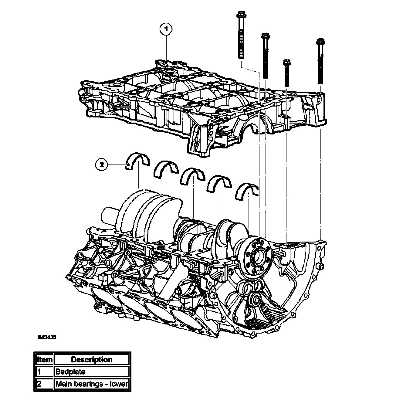 The bedplate is a structural casting bolted to the bottom of the cylinder block to retain the crankshaft. The use of a bedplate further improves rigidity. Iron inserts, cast into the main bearing supports of the bedplate, minimize main bearing clearance changes due to heat expansion.