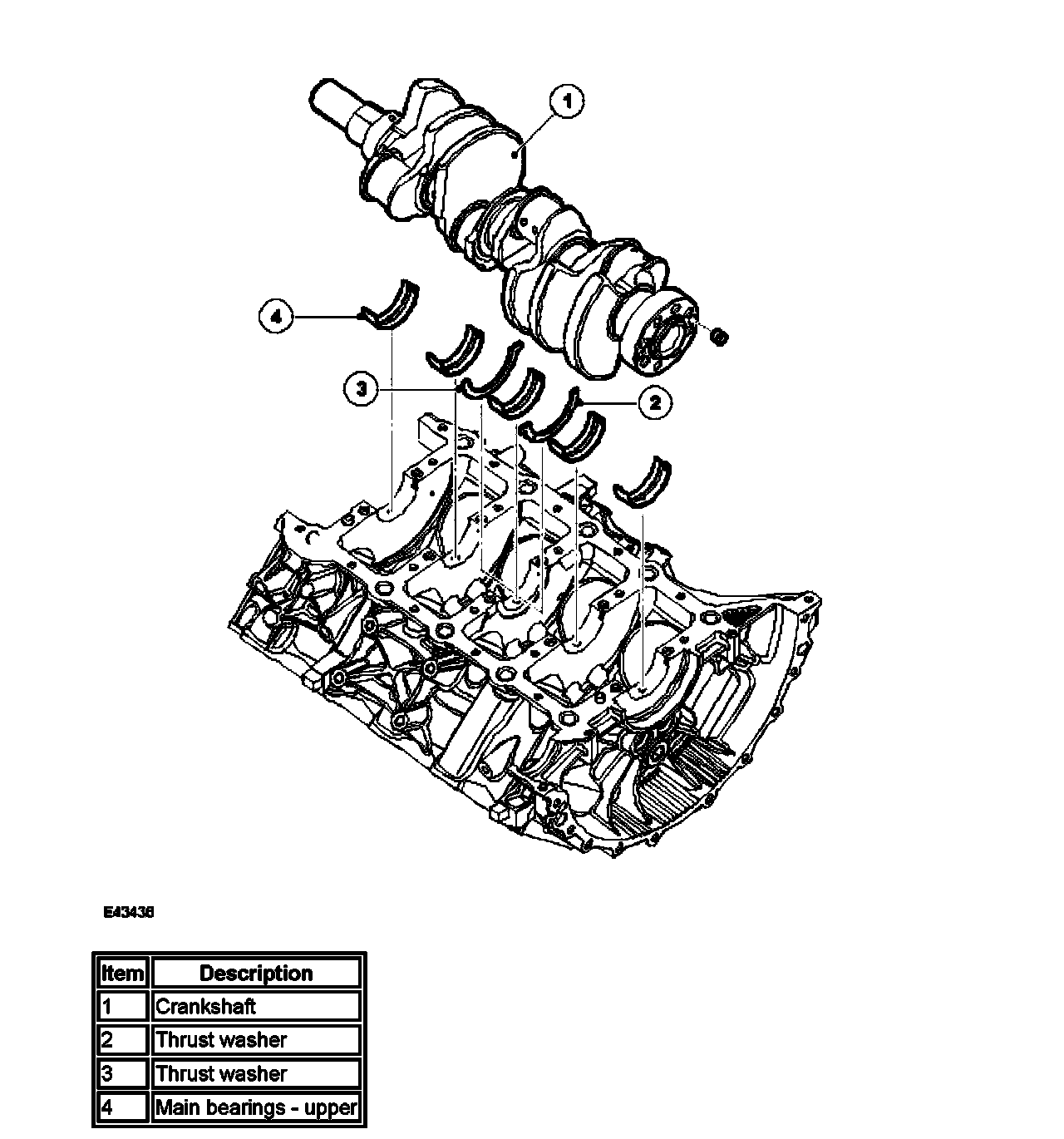 The main bearings are aluminum/tin split plain bearings. An oil groove in the upper half of each bearing transfers the oil into the crankshaft for lubrication of the connecting rod bearings. A aluminum/tin thrust washer is installed each side of the top half of the center main bearing.