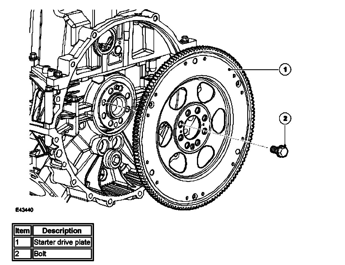 The starter drive plate is attached to the rear of the crankshaft. A timing disc, for the engine speed sensor, is spot welded to the front face of the drive plate.