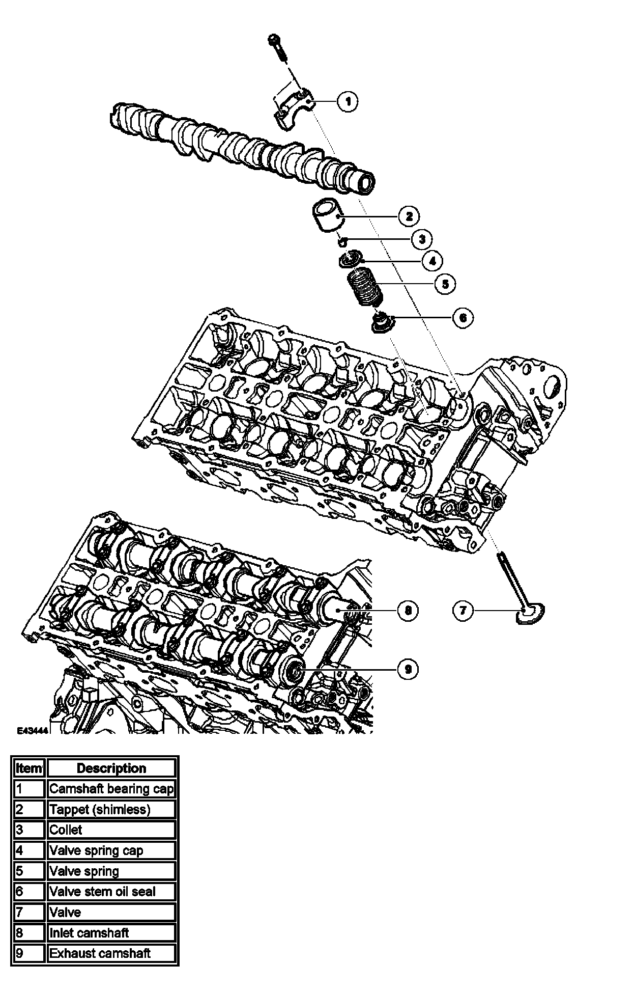 The camshafts are manufactured in chilled cast iron. Five aluminum alloy caps retain each camshaft. Location numbers, 0 to 4 for the intake camshaft and 5 to 9 for the exhaust camshaft, are marked on the outer faces of the caps.