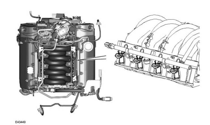 Eight, top fed, eight hole, fuel injectors are installed in the fuel rails. The injectors are electromagnetic solenoid valves controlled by the ECM. Two O-rings seal each injector to manifold interface. The fuel jets from the injectors are directed onto the back of the intake valves.