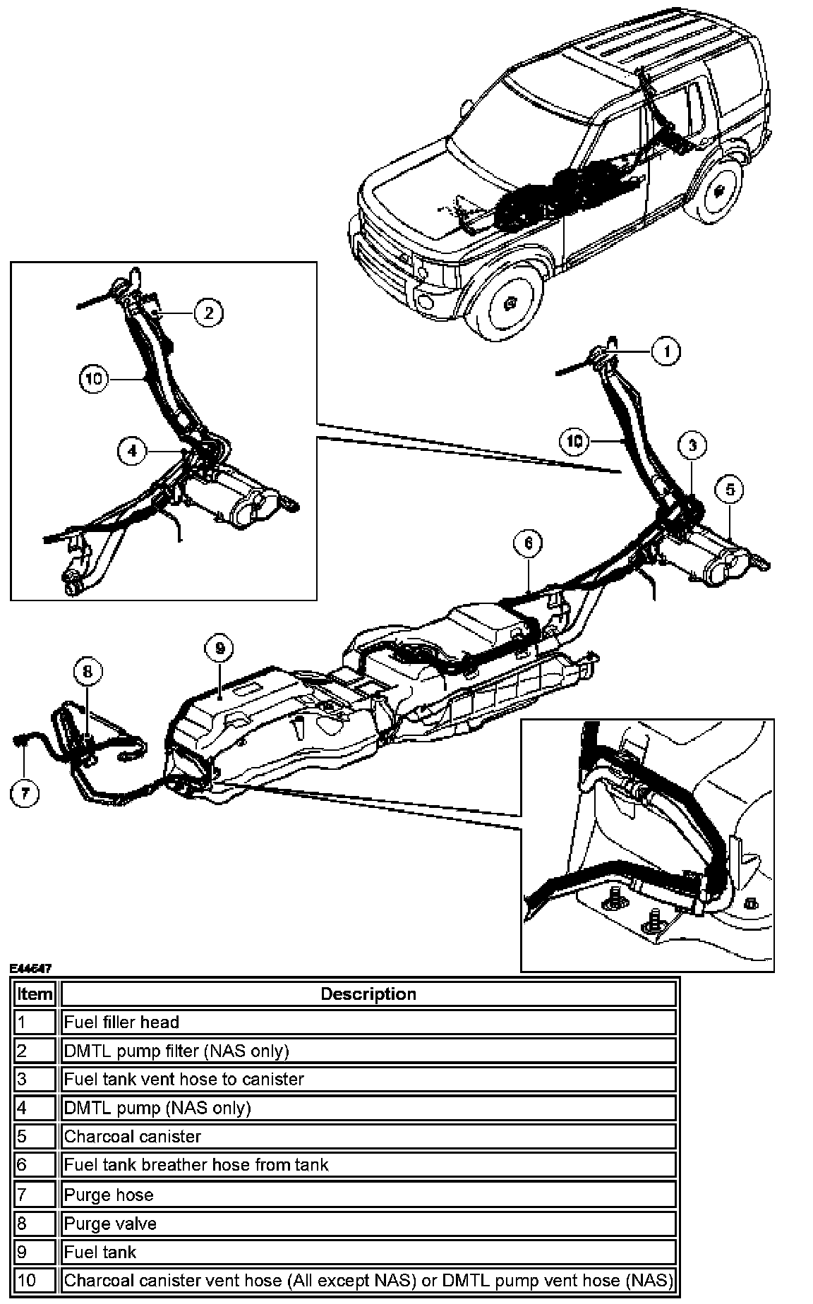 On NAS vehicles the system does not include a pressure test point. Pressure testing of the purge valve hose is achieved by disconnecting the purge valve joint on the underside of the vehicle, forward of the fuel tank and connecting a special tool to allow the system to be pressure tested. The test performs a pressure test on the purge hose connection forward of the fuel tank back to the charcoal canister. The special tool is then connected to the purge hose connection forward of the fuel tank to perform a pressure test on the purge hose to the purge valve.