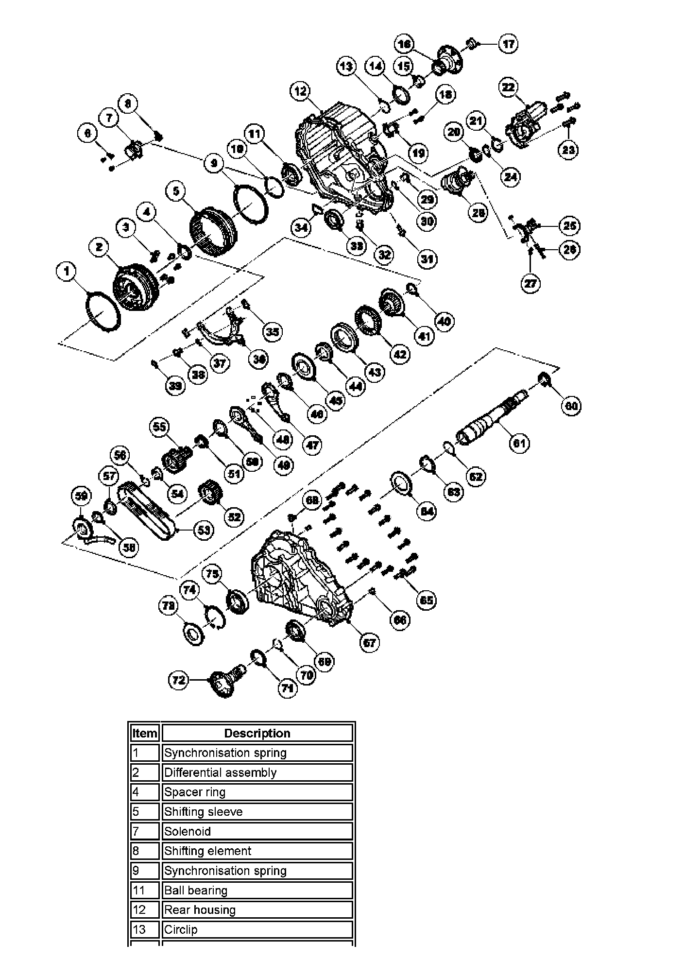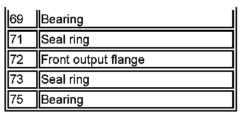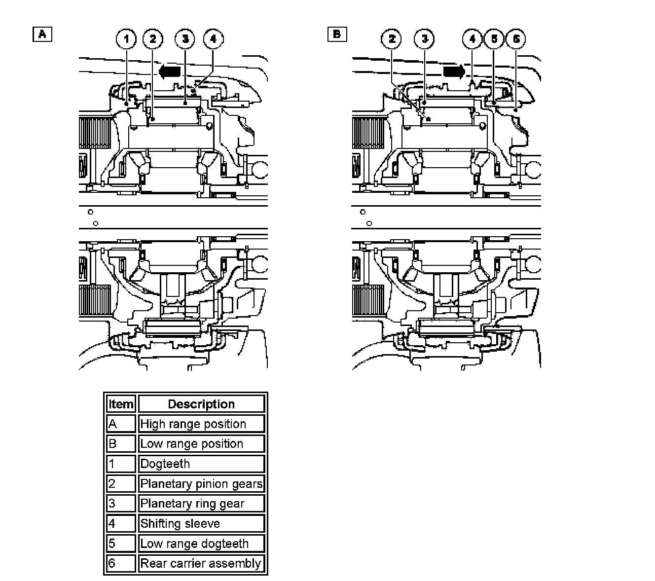 In low range the motor moves the shifting sleeve (4) in the direction of the low range dogteeth (5). The low range dogteeth, with the synchronization cup and spring, are fixed to the rear carrier assembly (6). When the shifting sleeve is engaged with the low range dogteeth, the planetary ring gear (3), via the shifting sleeve, is stationary and the planetary pinion gears (2), via the planetary bolts, turn the differential side gears with 2.93: 1 ratio.