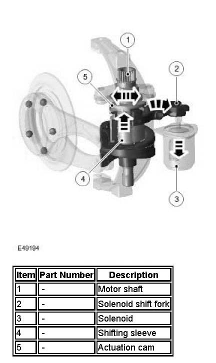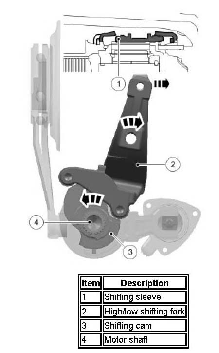 To actuate the high/low range change, the transfer box control module de-energizes the solenoid (3). A spring in the solenoid retracts the solenoid pin and rotates the solenoid shift fork (2). This engages the shifting sleeve (4) to the dogteeth on the high/low actuation cam (5). The rotational movement of the motor shaft (1) is then linked to the cam.