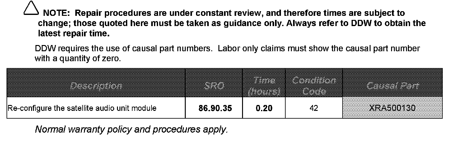 Should a customer express concern about the above symptoms, re-configure the SDARS module by following the Repair Procedure in this Bulletin.