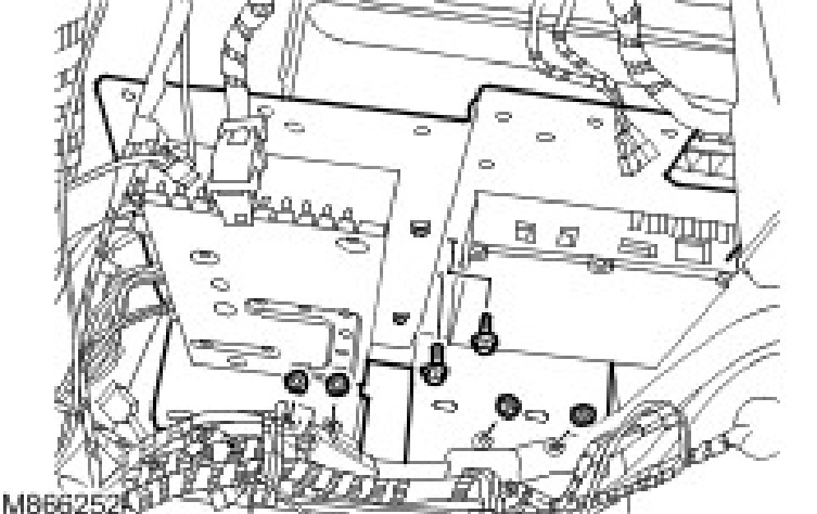 ^ Remove the 2 bolts and 4 nuts securing the audio unit amplifier and TV receiver mounting bracket.