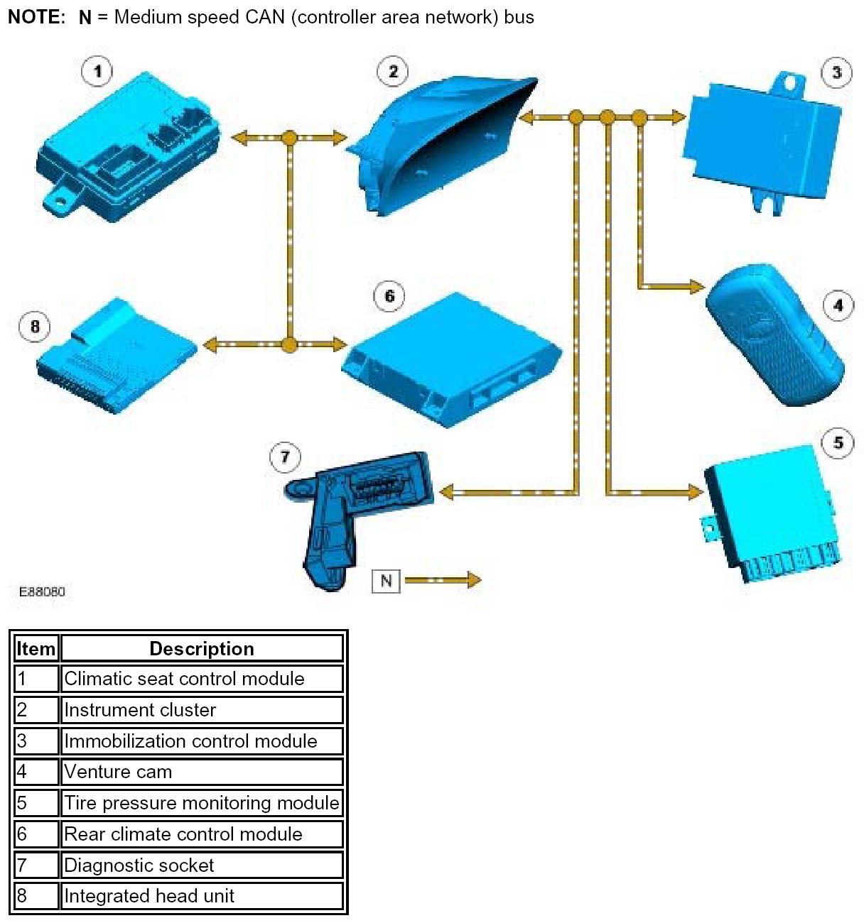 Both the medium and high speed CAN (controller area network) bus are connected to the instrument cluster and the diagnostic socket.The medium speed CAN (controller area network) bus terminates at the integrated head unit and the immobilization control module.The high speed CAN (controller area network) bus terminates at the parking brake control module and the ABS (anti-lock brake system) control module.