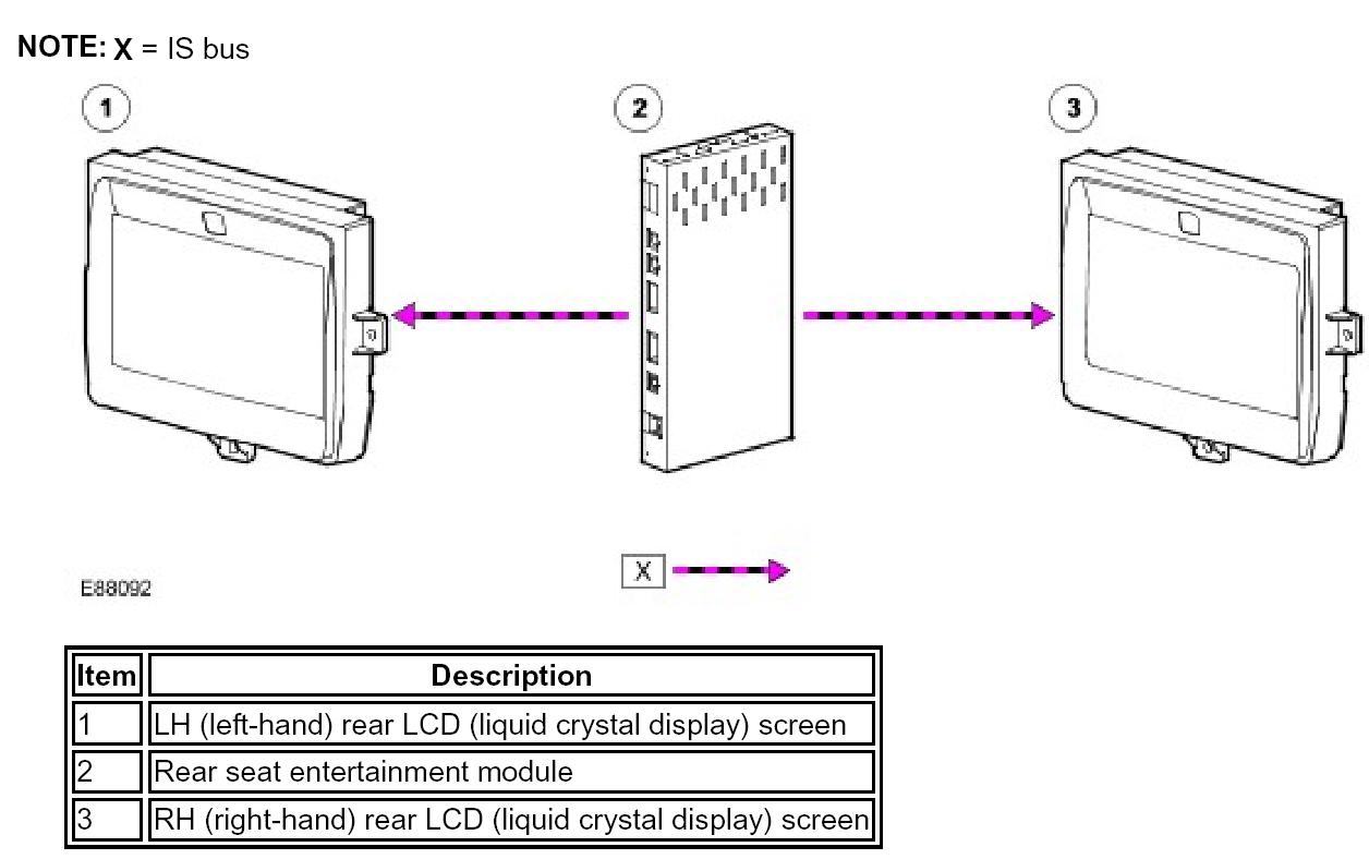 The IS bus is a dedicated Land Rover corporate network used to transfer information between the rear seat entertainment module and the two rear LCD (liquid crystal display) screens.