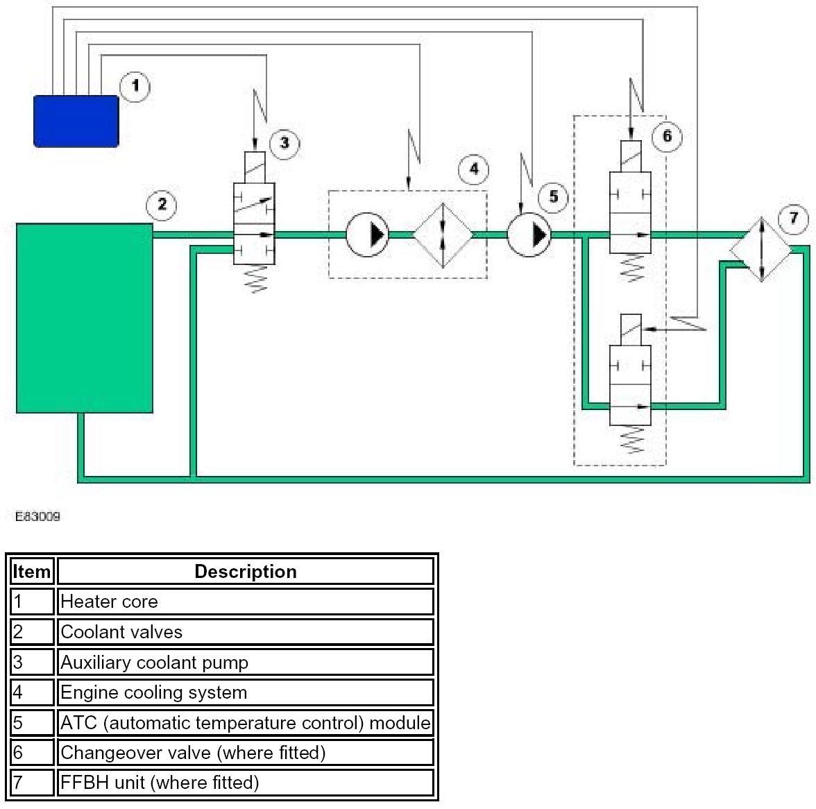 When the ambient temperature is 10 degrees C (50 degrees F) and below, the ATC (automatic temperature control) module signals the coolant valves to remain open.When the ambient temperature is more than 10 degrees C (50 degrees F), the ATC (automatic temperature control) module checks the existing heater core temperature and, if necessary, increases the open time of the coolant valves to produce a minimum heater core temperature of 30 degrees C (86 degrees F).