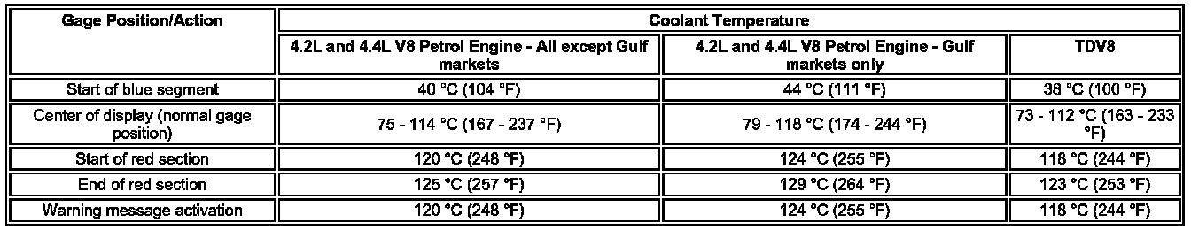 The following table shows ECT (engine coolant temperature) relationship to gage needle pointer position.