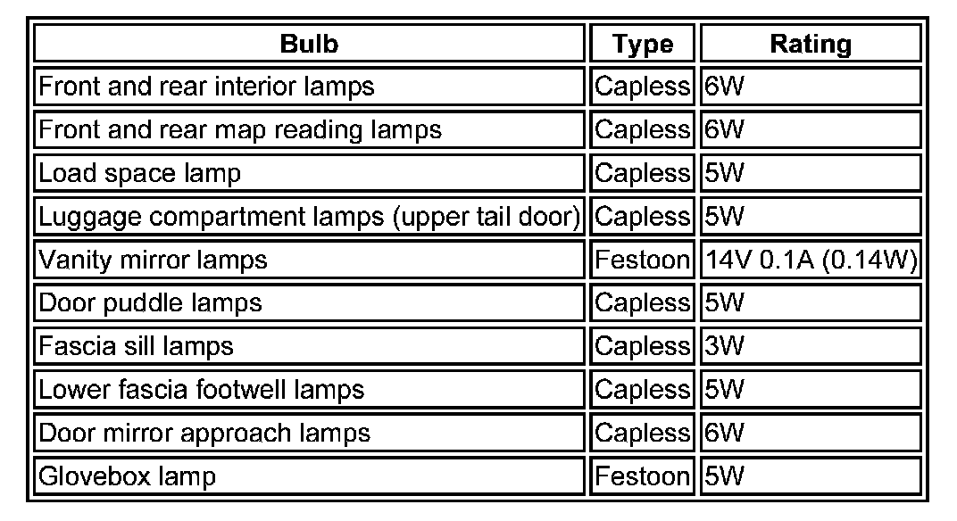 The following table shows the bulbs used for the interior lighting and their type and rating: