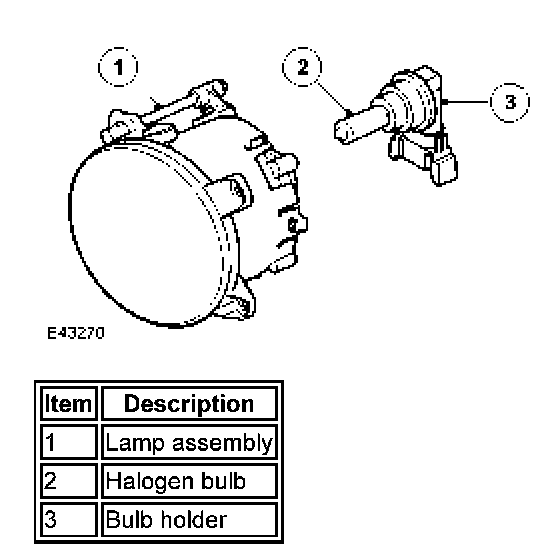 The 55 W halogen bulb is located in a holder. The holders are secured in the lamp housing by rotating through approximately 10 degrees. The holder has a connector to allow for connection to the electrical harness.
