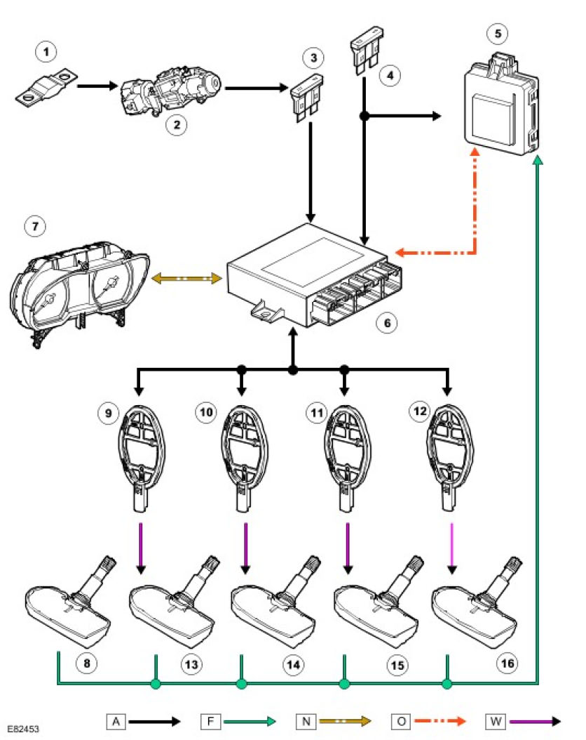 Each time the vehicle is driven, the TPMS module transmits a Low Frequency (LF) (125 KHz) signal to each initiator in turn. This is received by the tire pressure sensor which transmits a Radio Frequency (RF) (315 or 433 MHz depending on market) signal to the RF receiver. This signal contains coded data which corresponds to sensor identification, air pressure, air temperature and acceleration data. This signal is communicated to the TPMS module via a LIN bus.