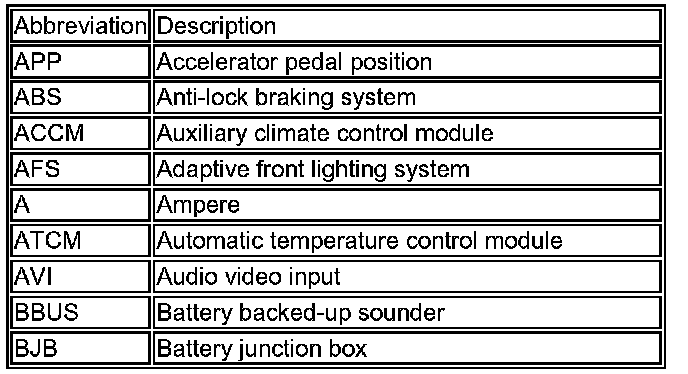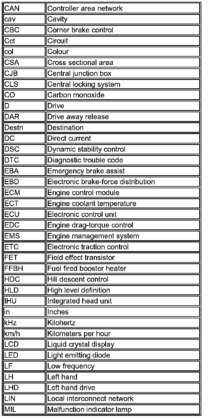 The following list contains wire colour codes used on the vehicle harnesses.