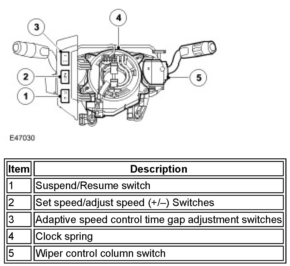 The speed control switches are located on the LH (left-hand) side of the steering wheel. The switches are connected via fly leads directly to the clock spring. All of the speed control switches are non-latching momentary rocker switches. The minimum set speed for speed control is 18 mph (30 (km/h). Speed control is automatically suspended if the vehicle speed falls below 15 mph (24 km/h).