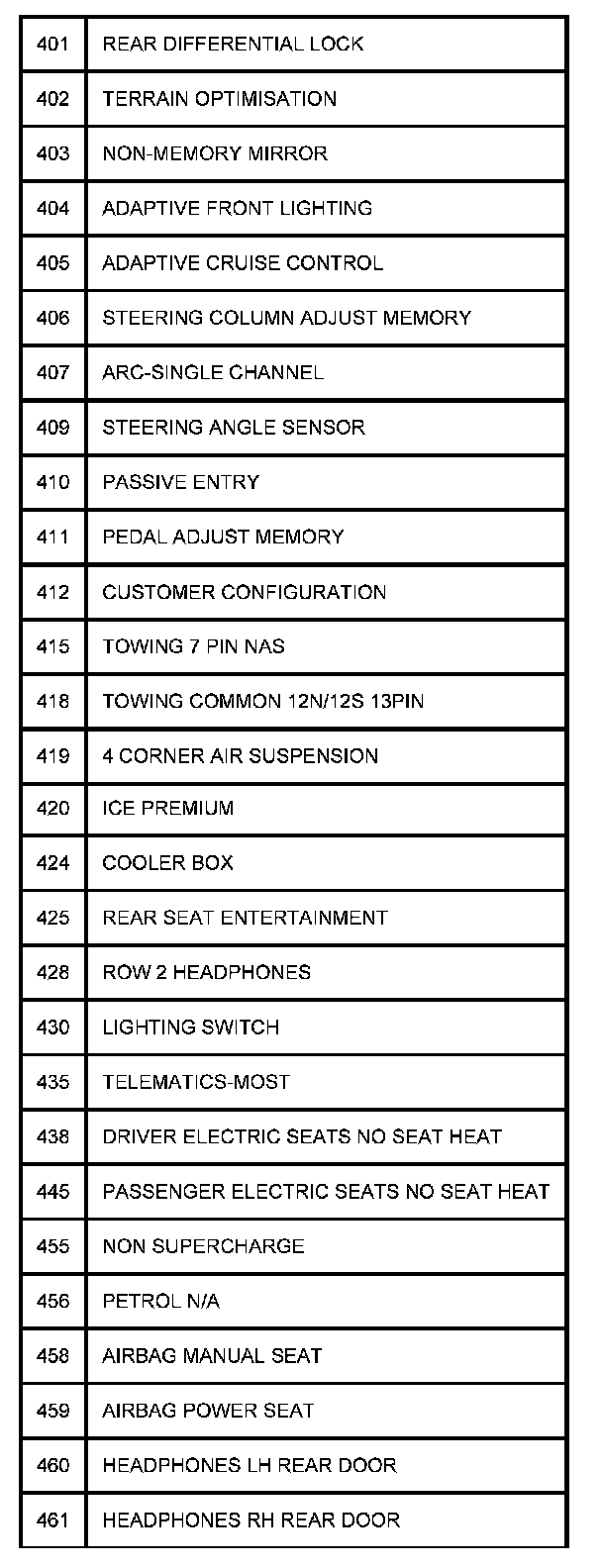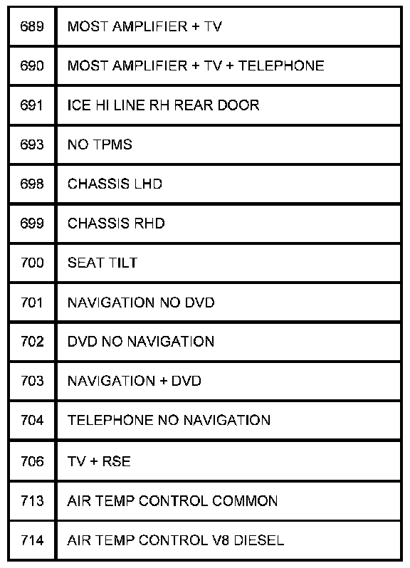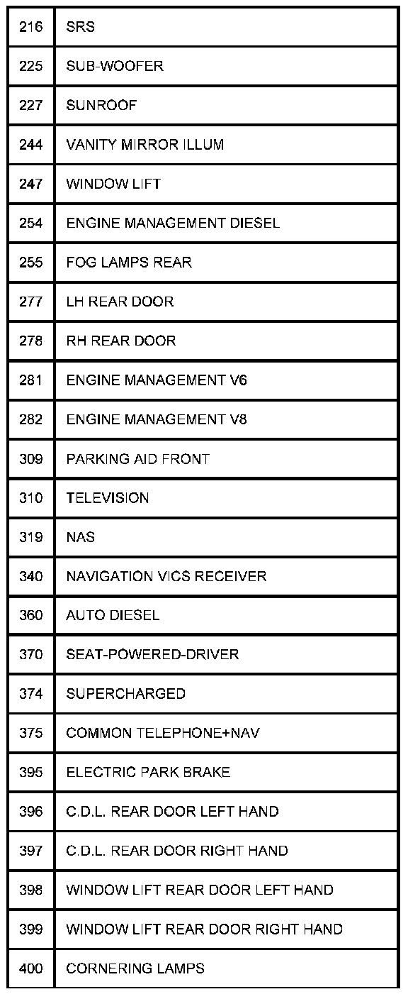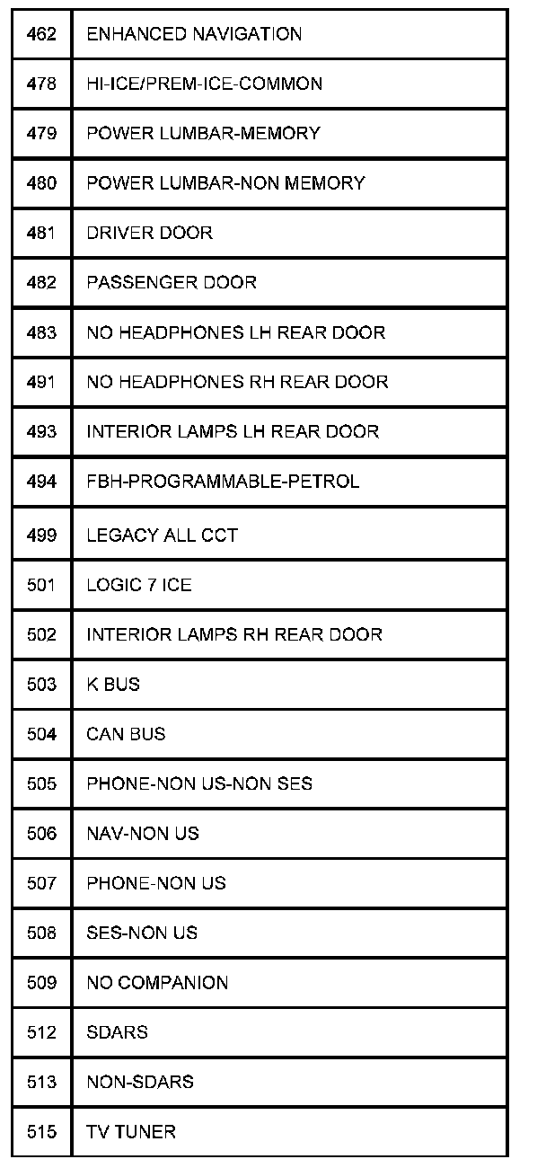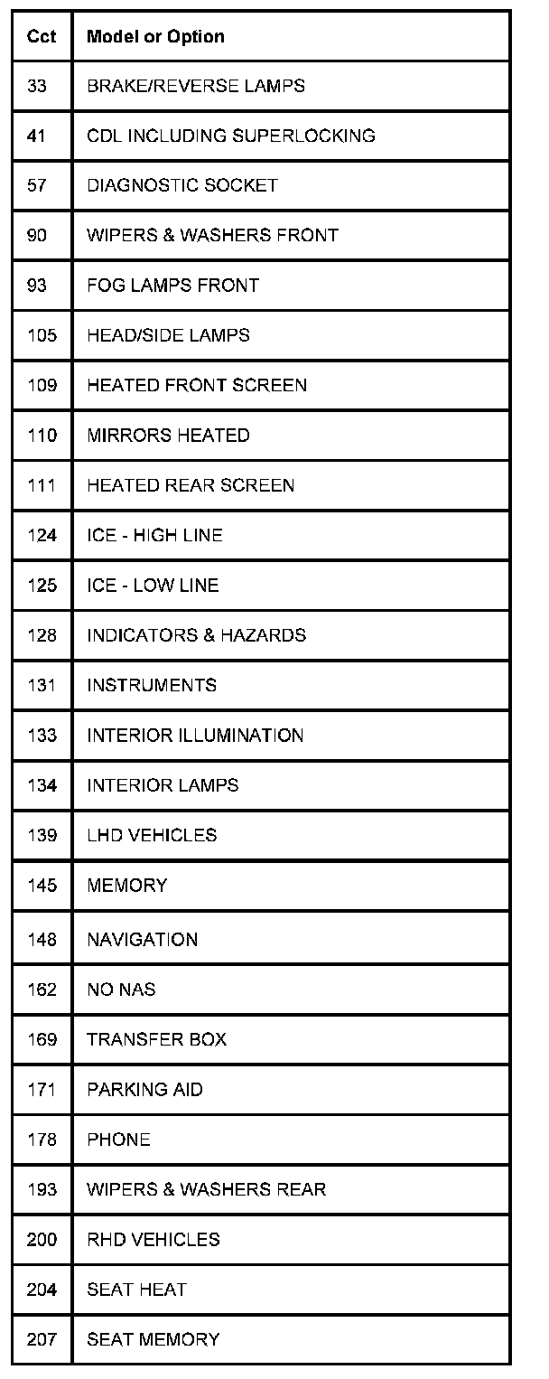 The following table contains a list of circuit (Cct) reference numbers against a description of the applicable model or option. This information should be used in conjunction with the connector pin-out tables to determine the wire configuration of the vehicle under test.