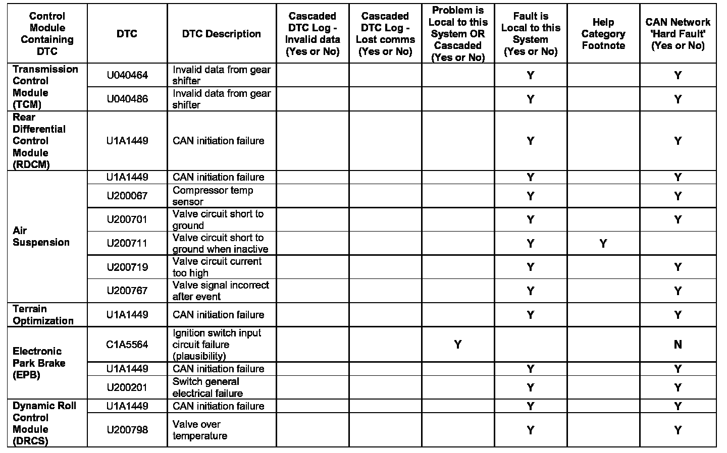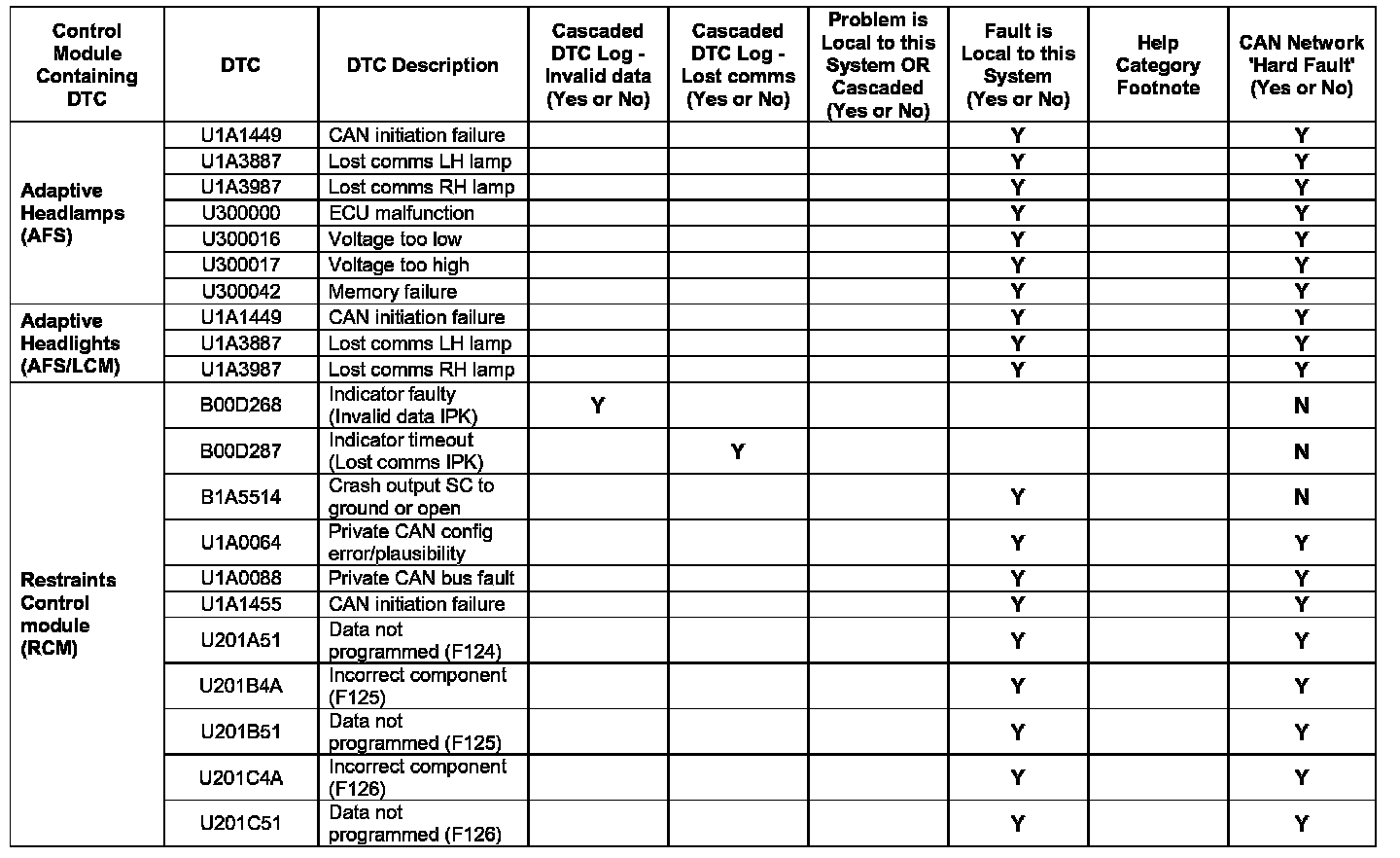 NOTE: This table indicates the following DTC data, applicable to RANGE ROVER SPORT P, C and B codes which are NOT necessarily hard faults, and U codes which ARE hard faults