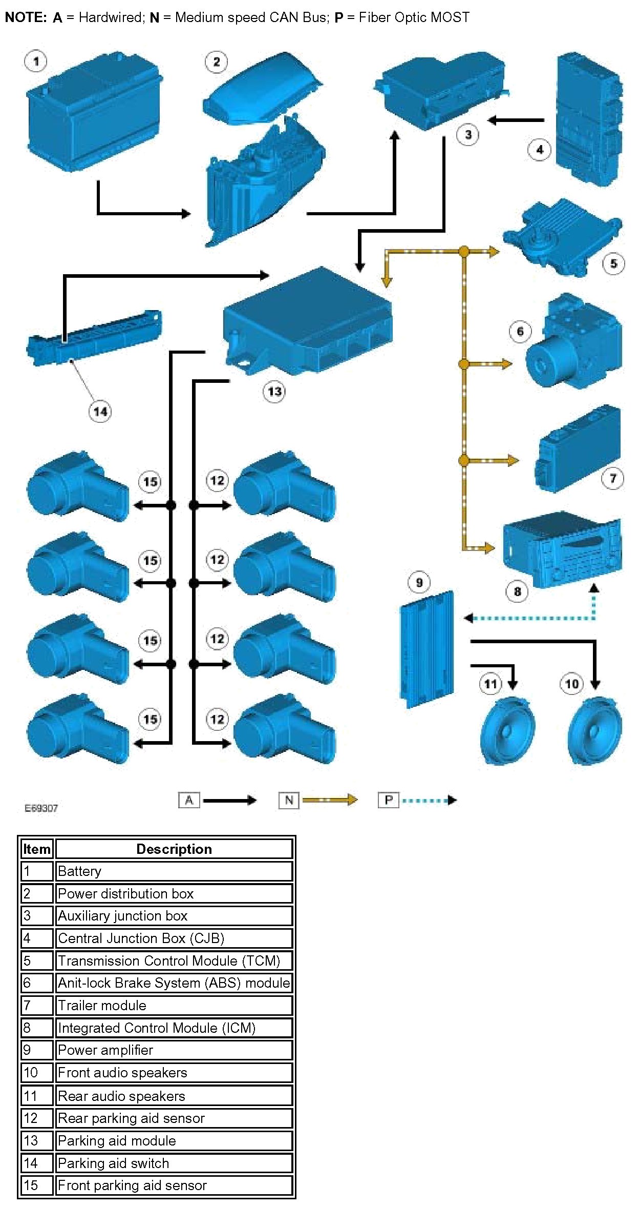 The parking aid module communicates via the medium speed Controller Area Network (CAN) bus with the audio system via the Integrated Control Module (ICM). The audio system then outputs the applicable warning tones from the front or rear speakers when an object is detected. The medium speed CAN bus is also used to collect vehicle data from other vehicle systems.