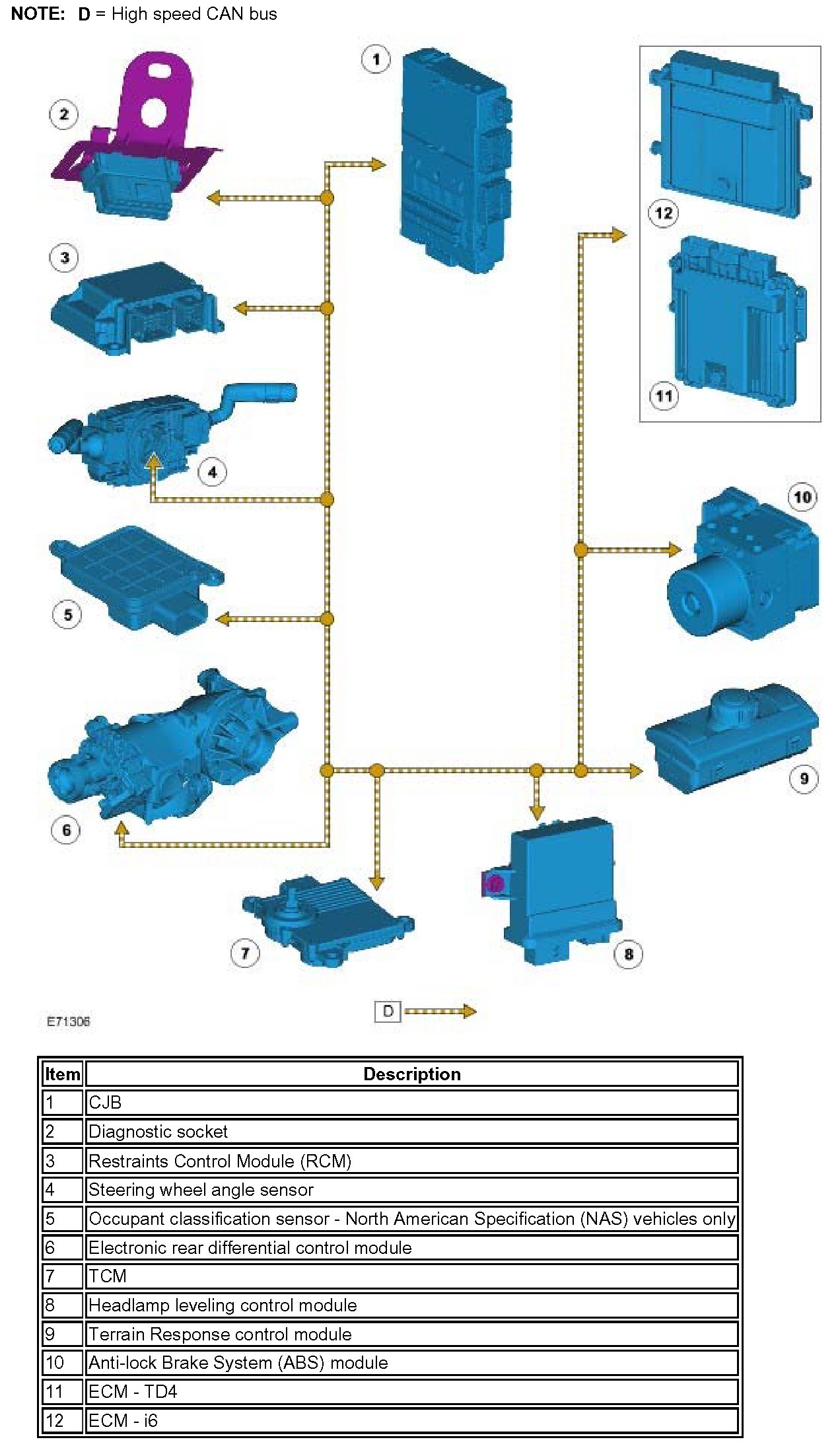 Two CAN bus networks are used on the vehicle; medium speed and high speed, with the Central Junction Box (CJB) acting as a gateway between the 2 networks. The table below shows the wire colors used on both networks.