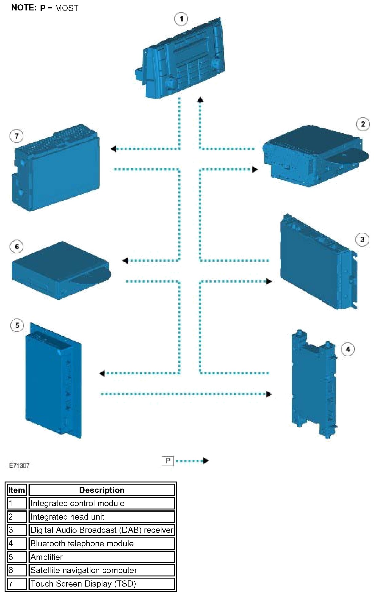 The Media Orientated System Transport (MOST) ring uses fiber optic cables to transport data and audio signals around the information and entertainment system. The fiber optic cables are arranged in a ring, with each unit on the ring having a 'MOST in' and 'MOST out' connection.