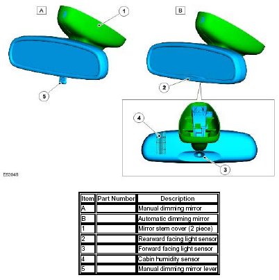 The interior rear view mirror is provided as a manual dimming or an electrically operated automatic dimming type. On certain vehicles, a cabin humidity sensor is incorporated in the electrically operated mirror casing.