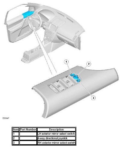 The door mirrors are controlled using a switch pack located on the driver's door. The switch pack contains 2 non-latching mirror select switches labeled 'L' and 'R' and a 4-way directional joystick. The switch pack is connected to the driver door control module via the LIN bus. The driver and front passenger door control modules are connected via the medium speed CAN bus. A hardwired connection between each door control module and the corresponding door mirror, provides the supply and ground paths for the mirror motors.
