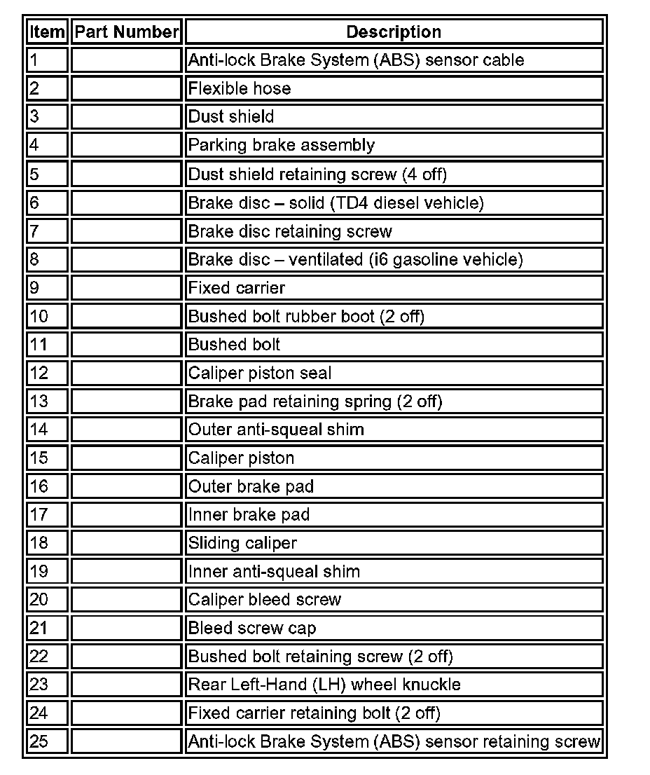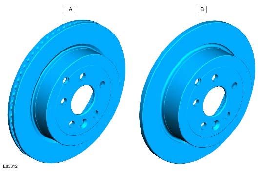 The ventilated type brake disc is 302 x 20 mm (11.89 x 0.79 in) in diameter and installed to the 3.2 liter i6 gasoline vehicle. The solid type brake disc is 302 x 12 mm (11.89 x 0.47 in) in diameter and installed to the 2.2 liter TD4 diesel vehicle. The brake disc is secured to the wheel knuckle hub with a single screw and is also retained by the 5 wheel securing nuts.
