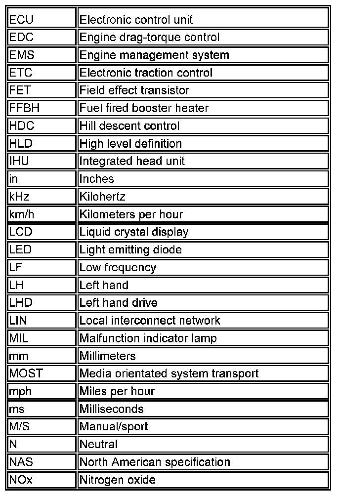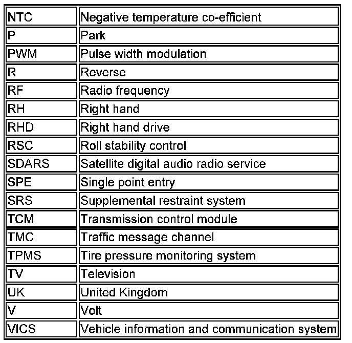 The following list contains wire colour codes used on the vehicle harnesses.