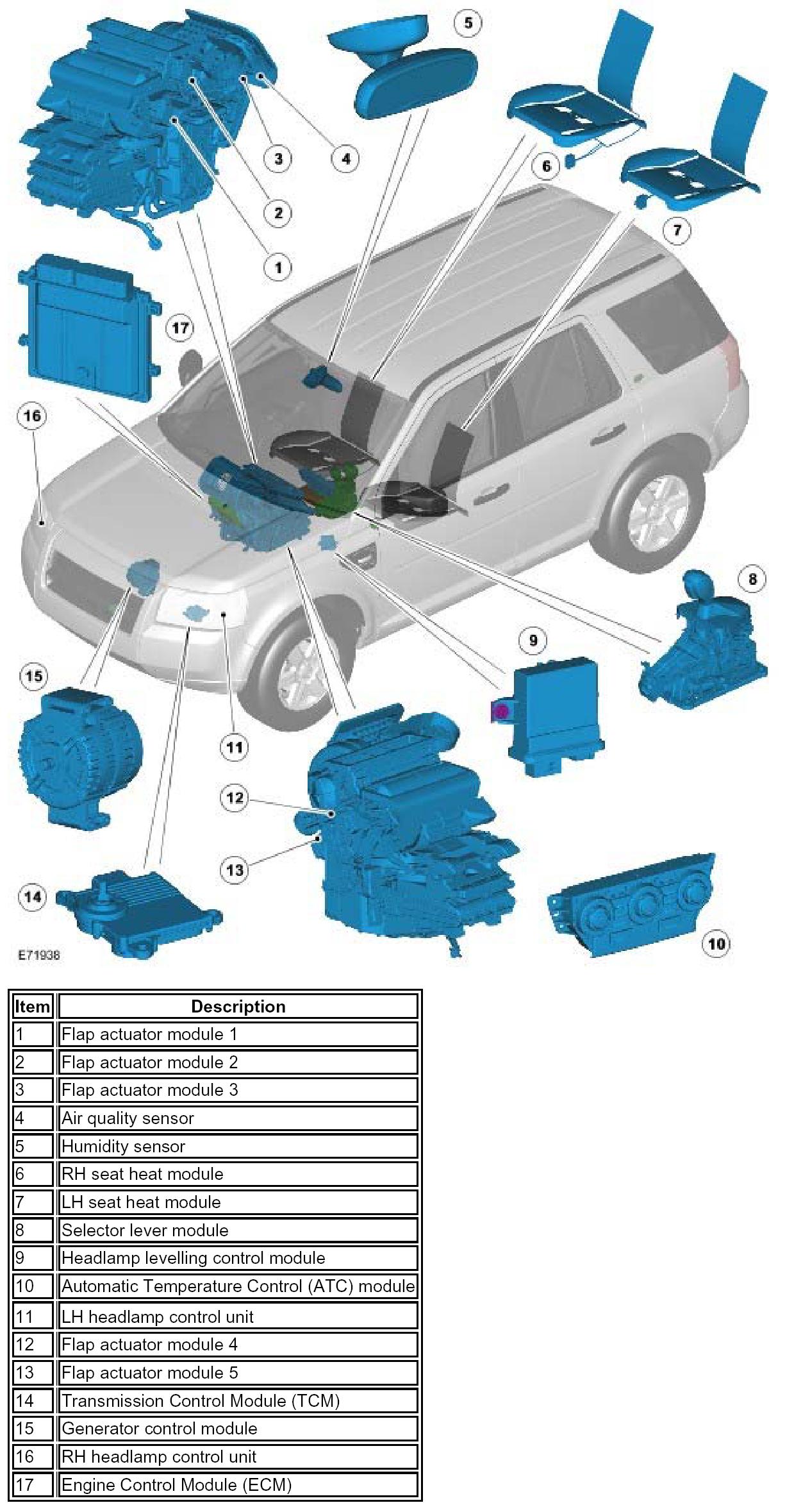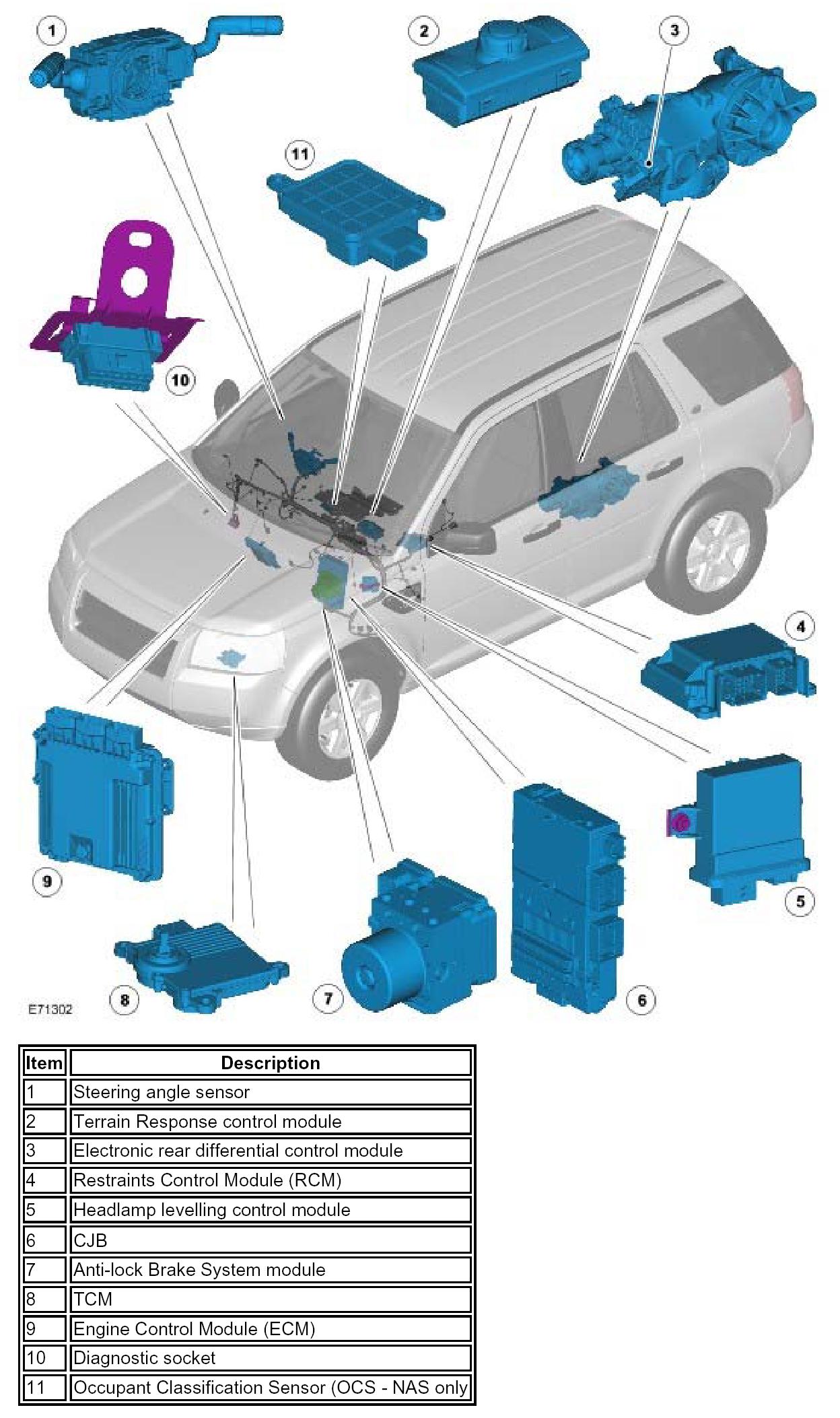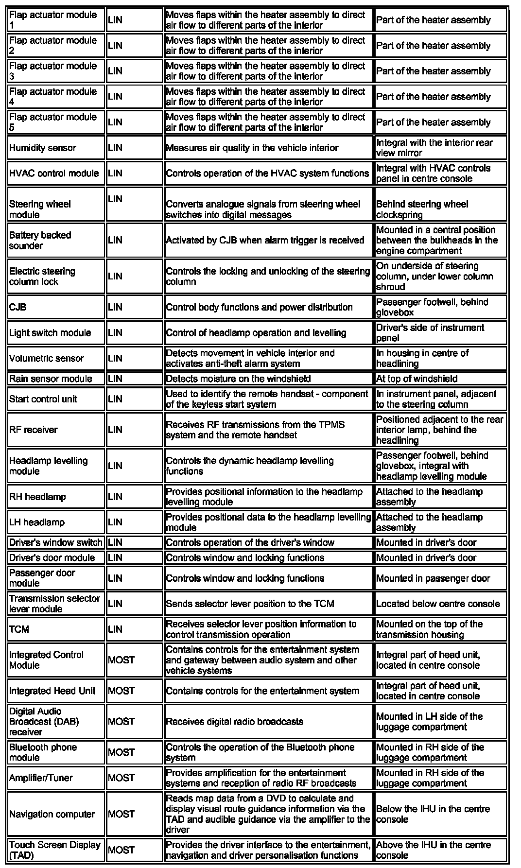 The following table shows each vehicle control module, the network system to which it is connected, its function and location in the vehicle.