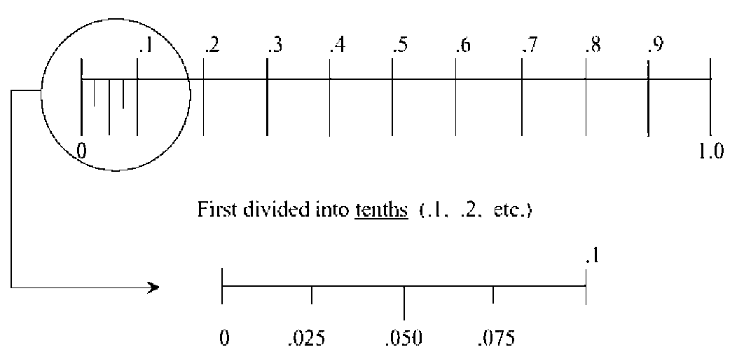 First divided into tenths (.1, .2, etc.)