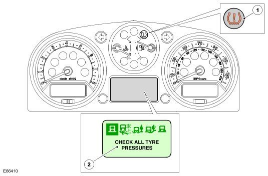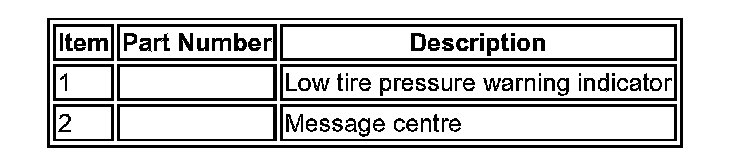 The warning indications to the driver are common on all vehicles fitted with TPMS The driver is alerted to system warnings by a low tire pressure warning indicator in the instrument cluster and an applicable text message in the message center.