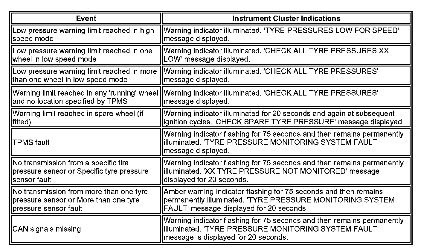 The TPMS software communicates with the instrument cluster via the medium speed Controller Area Network (CAN) bus to provide the driver with appropriate warnings. The TPMS software also indicates status or failure of the TPMS or components.