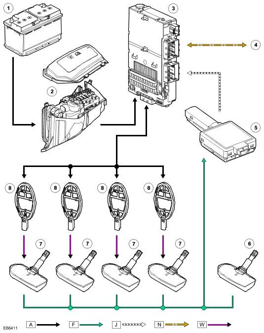 NOTE: A = Hardwired; F = RF transmission; J = ISO 9141 K Line; N = CAN bus Medium speed; W = LF transmission