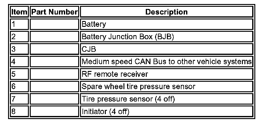 The 4 initiators are hard wired to the CJB. The initiators transmit 125 KHz Low Frequency (LF) signals to the tire pressure sensors which respond by modifying the mode status within the RF transmission. The 315 or 433 MHZ RF signals are detected by the RF receiver which is located at the rear of the vehicle, behind the headlining. The RF receiver is connected to the CJB on the Local Interconnect Network (LIN) bus. The received RF signals from the tire pressure sensors are passed to the CJB on the LIN bus and contain identification, pressure, temperature and acceleration information for each wheel and tire.