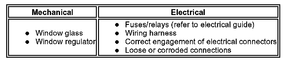 4. If the cause is not visually evident, check for Diagnostic Trouble Codes (DTCs) and Glass, Frames and Mechanisms