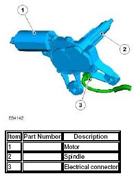 The single speed rear screen wiper motor is mounted on the inner surface of the liftgate and is secured by 3 bolts. Rubber bushes isolate the motor assembly from the body to help reduce the transmission of motor operating noise to the liftgate. The motor is located on a worm drive mechanism, which converts the rotary motion of the motor output spindle into the required arc for the rear wiper blade.