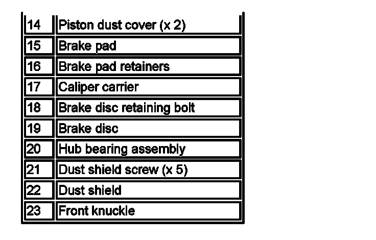 The brake caliper is attached to the rear of the front knuckle. The brake pads are made from an asbestos free material. The inboard brake pad of the left front brake incorporates a wear sensor.